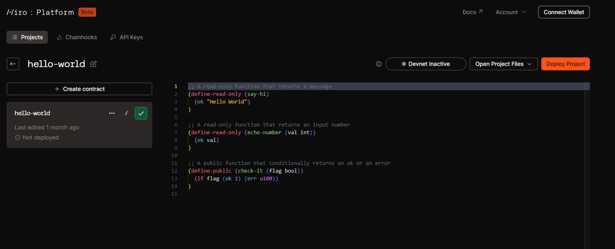 가입과 로그인이 완료되면 기본적인 코드가 작성되어 있는 hello-world 컨트랙트를 생성할 수 있습니다. 해당 컨트랙트를 생성하면 다음과 같은 화면이 됩니다.