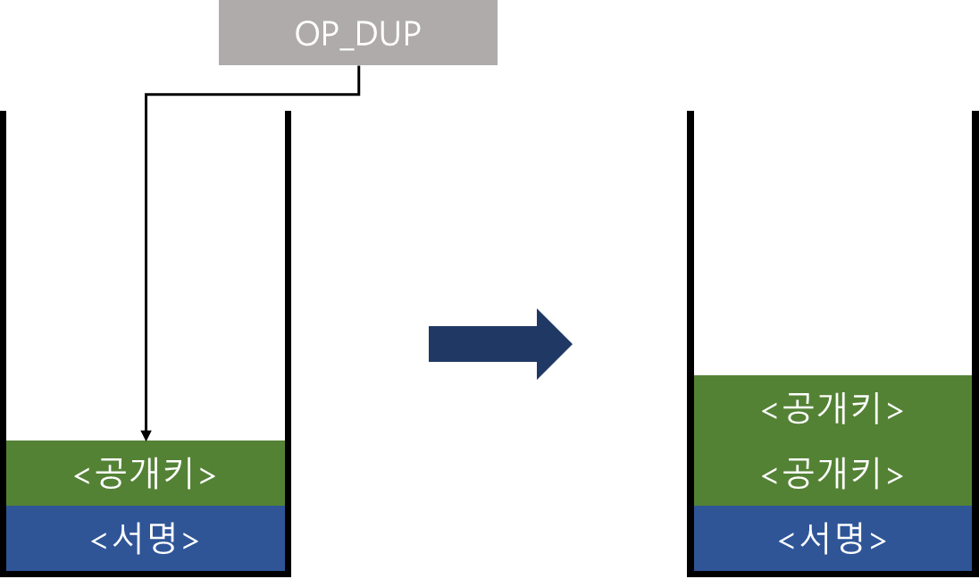 그다음 잠금 스크립트의 명령어를 차례로 사용합니다. 가장 먼저 사용될 명령어는 OP_DUP입니다. 해당 opcode는 스택에서 가장 위에 위치한 아이템을 복제하는 opcode입니다.