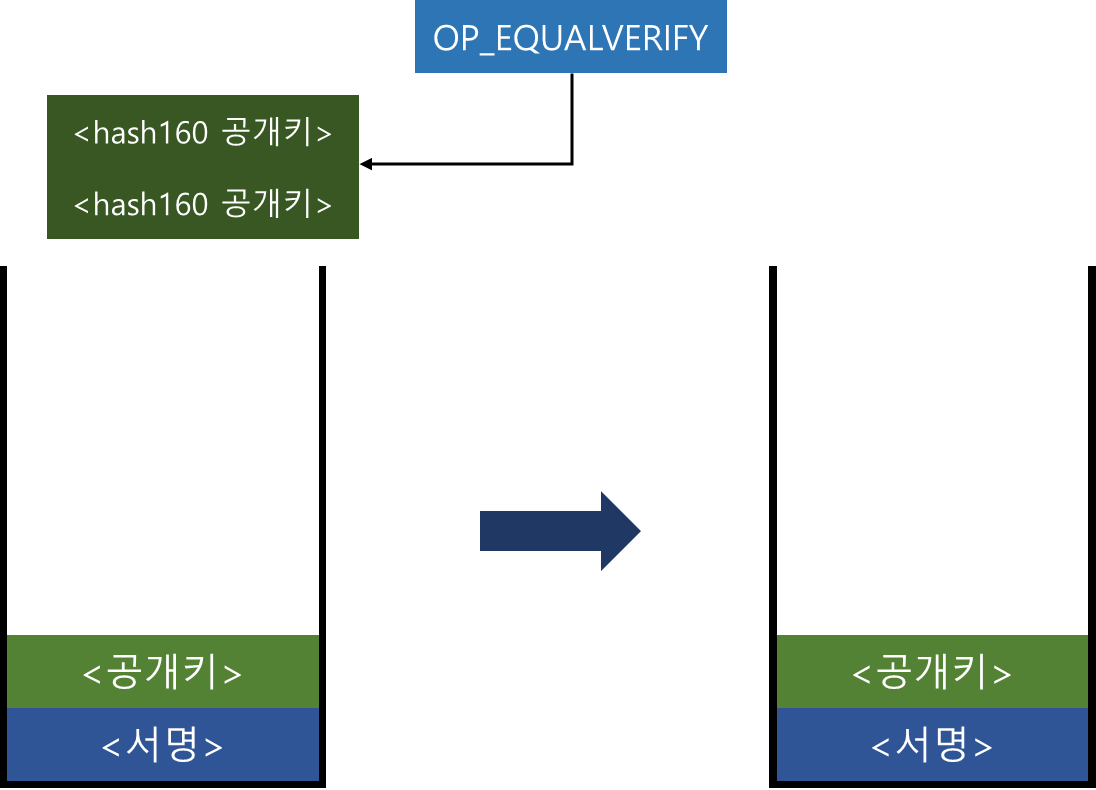 이제 OP_EQUALVERIFY를 실행합니다. 해당 명령어는 스택 가장 위에 있는 두 값이 같은지를 비교하고 검증하는 명령어입니다.