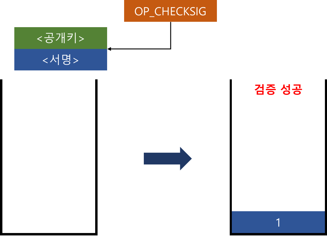 마지막으로 서명과 공개키를 OP_CHECKSIG로 검증합니다. 검증에 성공하면 스택에는 1만 남게 됩니다.