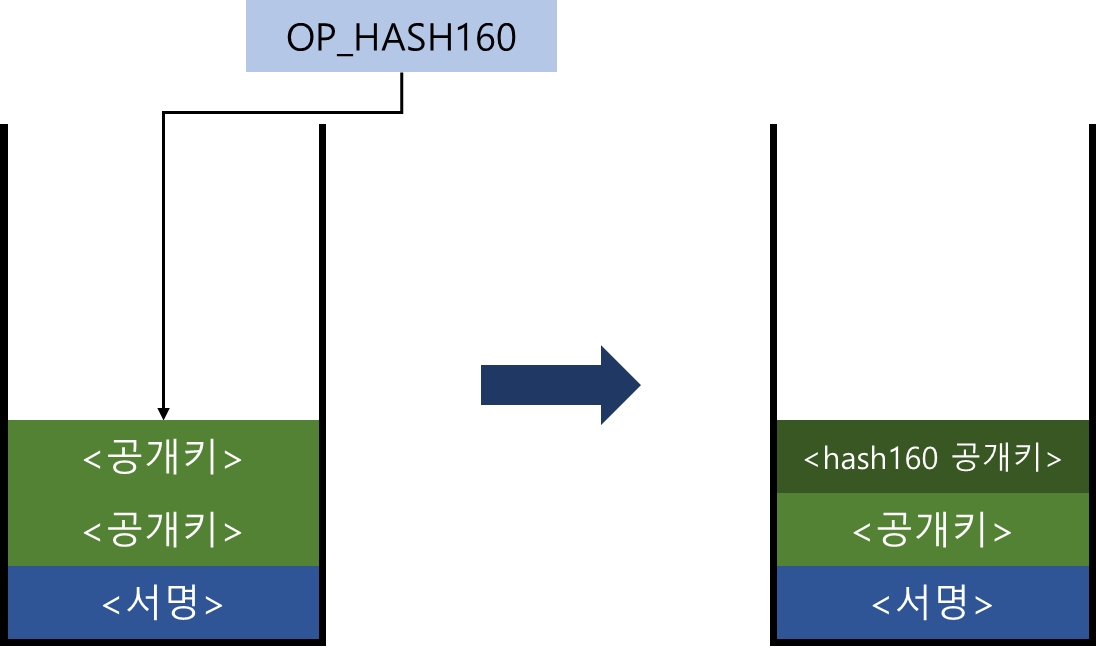 이어서 OP_HASH160을 사용합니다. OP_HASH160은 스택에서 가장 위에 위치한 아이템의 hash160 값을 계산하여 스택에 반환합니다.